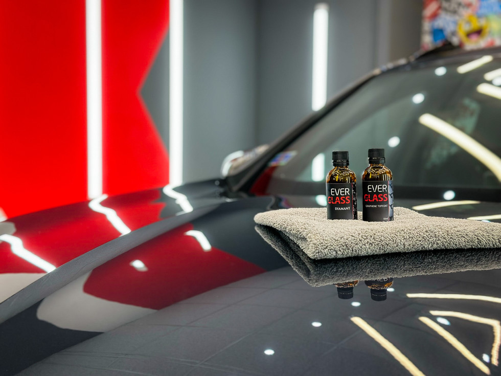 Savā darbā izmantojam Everglass keramikas pārklājumus. Mēs neesam saistīti ar nevienu zīmolu un nepārdodam šos produktus - mēs vienkārši izmantojam pierādītus laika un vairāku testu (kuru mūsu viesi vienmēr var apskatīt) produktus. Starp citu, mēs arī pārklājam savas pašu automašīnas ar Everglass keramiku.